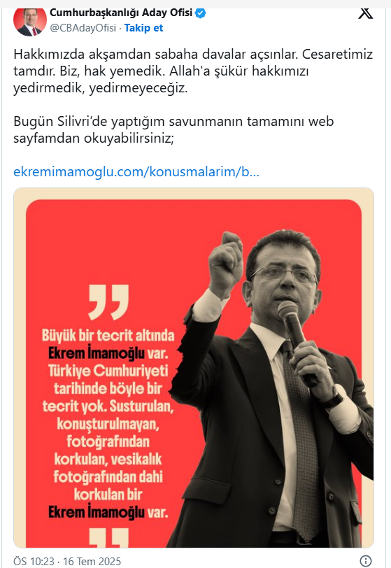 İmamoğlu, Silivri’de yaptığı savunmanın tam metnini de kamuoyuyla paylaşarak şeffaflık çağrısında bulundu. Savunma, ekremimamoglu.com adresinde yayımlandı.