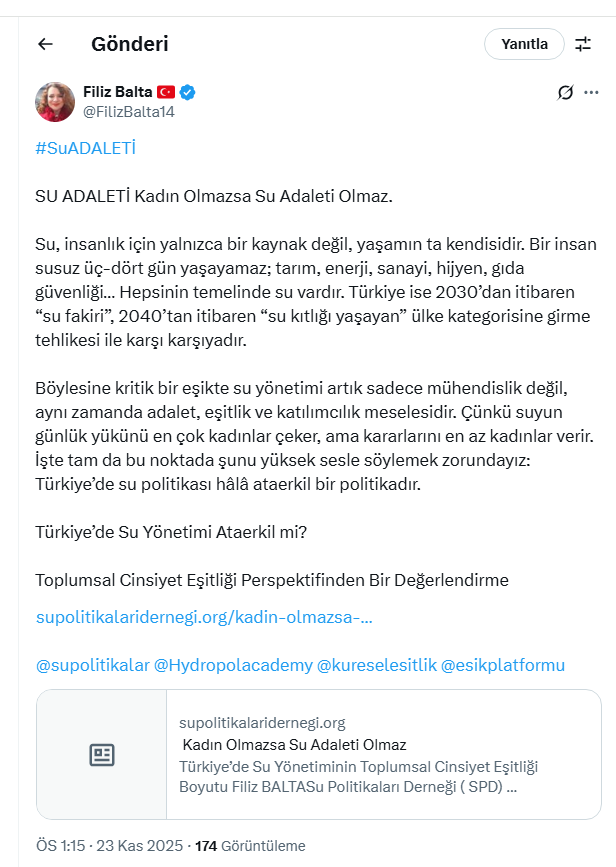 Balta paylaşımında, suyun yalnızca bir doğal kaynak değil, yaşamın temel ihtiyacı olduğunu hatırlatarak Türkiye’nin 2030 itibarıyla “su fakiri”, 2040 sonrasında ise “su kıtlığı yaşayan ülke” kategorisine girme tehlikesini vurguladı.